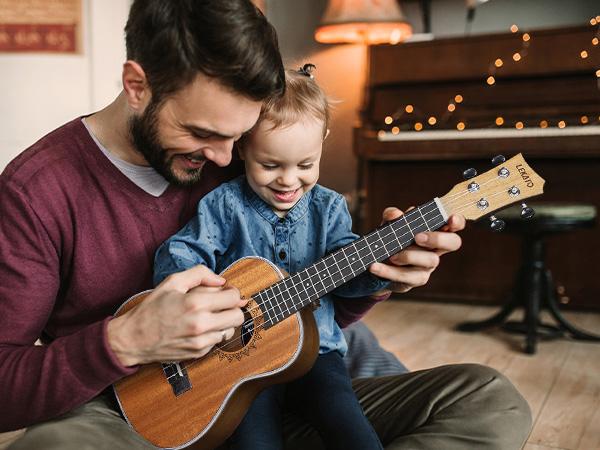 Ukulele has only four strings, which makes chord shapes and scales easier to learn Its soft nylon strings are gentler on your fingertips. Perfect for players of all ages and is a great learning tool for beginners, young and old It is ideal as a gift for birthdays, Christmas, Thanksgiving, etc